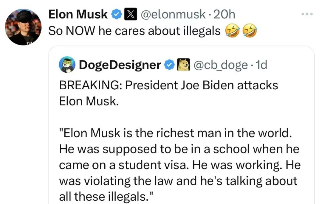 被拜登讪笑曾是又名“犯警劳工”,马斯克反讽修起